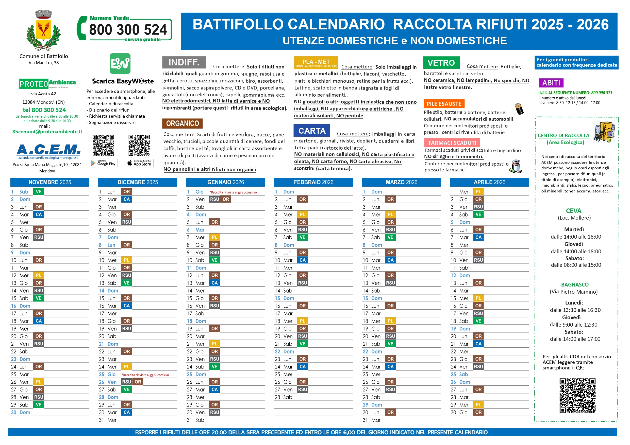 Nuovo calendario della raccolta differenziata da novembre 2025 ad ottobre 2026